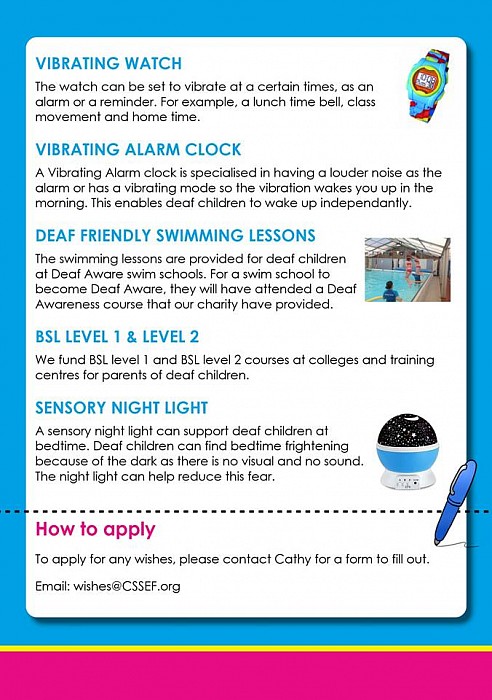 We will consider requests for funding which will be of clear and direct benefit to a deaf child or deaf children. Wishes applications are usually to fund specific products, equipment or services that are for the direct benefit of the child or children. There is no lower or upper limit on the level of funding that may be awarded. Applications can only filled out by where the child is a resident within Surrey, Hampshire, Berkshire and areas of London that were previously Surrey.